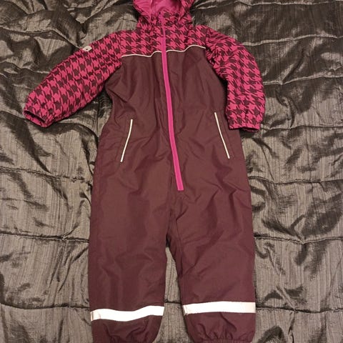 Lasten talvihaalari koko 110 Peuhu. Kulumaa on ja toinen heijastin nauha repsottaa, muuten ehjä. Ohut toppahaalari, ei paukkupakkasille. Vaikka kakkoshaalariksi.