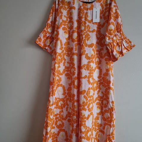 Marimekon kaunis altaani tuulahdus mekko. Niin miellyttävää ja kauniisti laskeutuvaa 60% kupro, 40% viskoosi, ei jousta.3/4 hihat, taskut sivuilla ja ihana rusettikiinnitys niskassa. Mustalla pohjalla herkkiä kukkia. Koko 46. Kai-kai 60cm, olka-helma 106cm. Erinomainen kunto.
