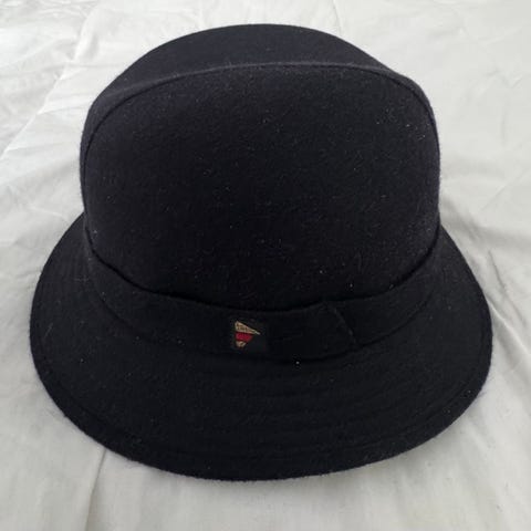 Pieni läikkä takana, liima irronnut ja jättänyt jäljet lierinauhan alta edessä.