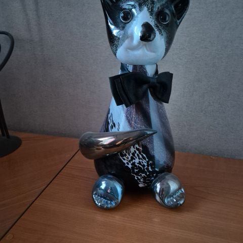 Painava kaunis lasinen kissa. Studiolasin valmistama. Toisesta korvasta puuttuu pala.