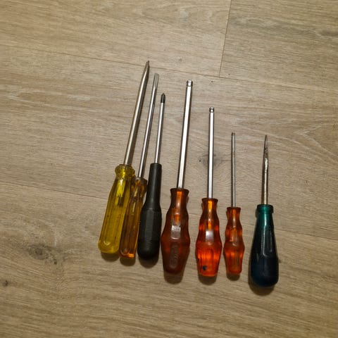 Nelikerroksinen laatikko, täynnä erilaisia poranteriä, ruuvikärkiä, lapateriä, hiontarenkaita, katkaisulevyjä jne.