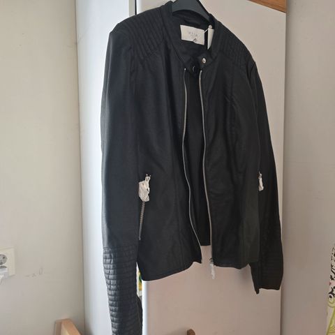 Vila nahkatakki mustassa värissä, naisten koko 38. Takki on valmistettu keinonahasta ja siinä on vetoketjukiinnitys sekä kaksi vetoketjutaskua edessä. Takki sopii monipuoliseen käyttöön.