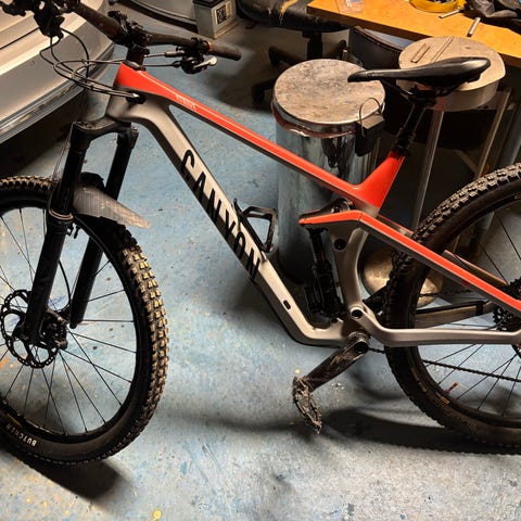 Osina RockShoxin Reba ilmakeula etälukituksella, Heyes Stroker hydr. levyjarrut, Cane Creek ohjainlaakeri, e-Thirteen ketjunohjuri, RaceFace turbine kammet yms. Painoa kuvan kokoonpanossa n. 12,5kg.