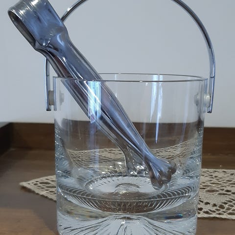 Kosta Bodan valmistama Vicke Lindstrand suunnittelema Calypso jääpala-astia. Kristallia ja ruostumatonta terästä. Korkeus 16cm / 11cm. 1960-luvun tyyliä baarikaappiin.