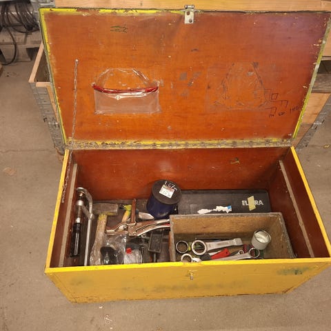 Jämäkkä käytetty vanerinen työkalulaatikko lukittavalla kannella sisältäen reilun määrän esim. hitsaajan työkaluja.