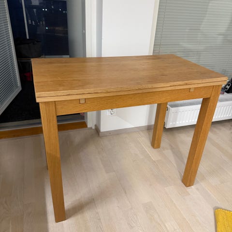Myydään ruokapöytä pois muuton tieltä. Todella hyvän kokoinen ruokapöytä, johon mahtuu mukavasti kahdeksan ihmistä istumaan ympärille ruokailemaan – tarvittaessa enemmänkin. Keskelle mahtuu myös mukavasti tarjoiltaviakin. Ruokapöytä on liian suuri tulevaan asuntooni, joten myyn sen pois.