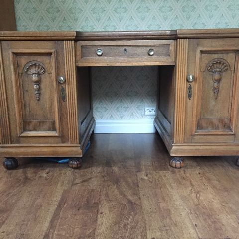 Moderni työpöytä mahd. 60-luvulta. Viisi laatikkoa. Mustat jalat, Tammenväriset puuosat. Massiivipuuta ja levyä.