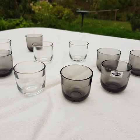 Kaj Frankin suunnittelema lasi "5023", snapsilasi / ryyppylasikoko, jonka korkeus on 5,5 cm ja suuaukon halkaisija 5,5 cm. Puristelasia. Tarjolla 5 kpl lasia, jotka kaikki ovat täysin ehjiä ja naarmuttomia. Yhdessä lasissa vielä vanha Nuutajärven tarra tallella. Väreinä 2 ruskeaa, 1 rusehtavan harmaa ja 1 sinertävän harmaa lasi. Hinta on 4 lasin yhteishinta. Viimeinen kuva on Suomen lasimuseon julkaisemast kirjasta Kaj Franck & geometria.