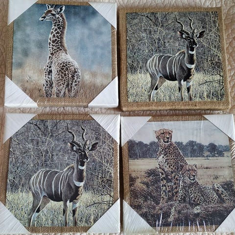 Myydään kuvan mukainen setti lautasen mallisia tauluja, joissa takana reiät ripustus narulle tms. Aiheena suloisia eläimiä.