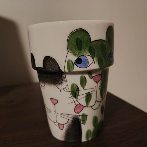 Käsinmaalatut posliiniset kissamukit, 2 erilaista.