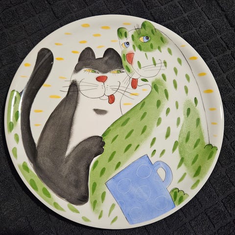 Lisäksi pikkulautanen, jossa toisella puolella sininen kissa ja toisella teksti Lazy Cat. Lautasen halkaisija 11 cm.