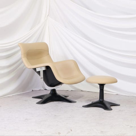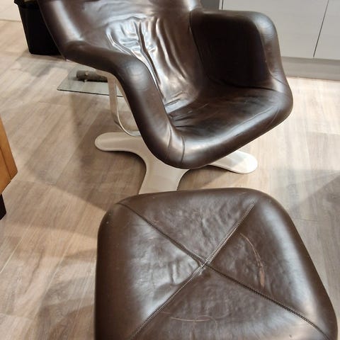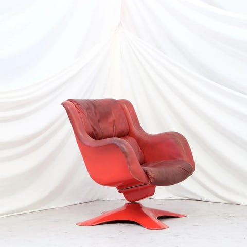 Karuselli-nojatuoli, jonka on suunnitellut Yrjö Kukkapuro 1960-luvulla, on todellinen ajattoman muotoilun ikoni. Tuolissa on ylellinen, patinoitunut terracotta-nahkaverhoilu yhdistettynä harvinaiseen ruskeaan jalustaan, mikä tekee tästä tuolista erityisen ainutlaatuisen. Kyseinen värimalli on tuotettu mittatilauksella Hotel Hesperialle Helsinkiin 1960-luvulla.