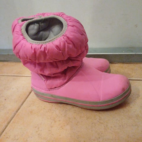 Kauniin vaaleanpunaiset Crocsit, syksy-talvikengät tekokarvavuorilla. Varren korkeus maasta 18,5cm, Pohjan sisäpituus n. 21,3cm, varren suun umpärys n.31cm. Hyvät, olleet käytössä tytöllä yhtenä talvena muiden kenkien ohessa.