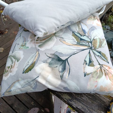 Koristetyyny, jossa on luonnonvärinen kangas ja oranssin sävyisiä kukkakuvioita. Tyyny on suorakulmainen ja sopii sisustukseen tai mukavuustarkoituksiin.