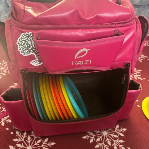 Uudenveroinen prodigyn latitude 64° frisbeelaukku ja viitisentoista kiekkoa.