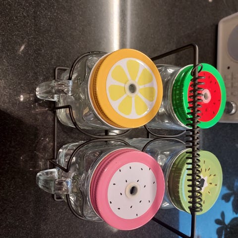 Muki lasia,kansi metallia ja pilli muovia.
