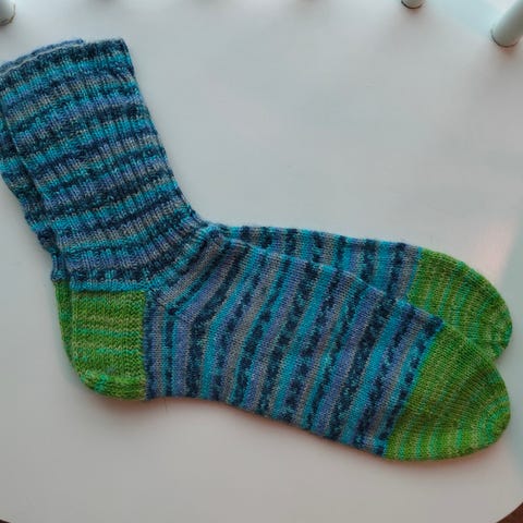 Kuvan uudet käsin neulotut villasukat koossa 39/40. Lankana Kotikulta sukkalanka (75% villaa ja 25% polyamidi).