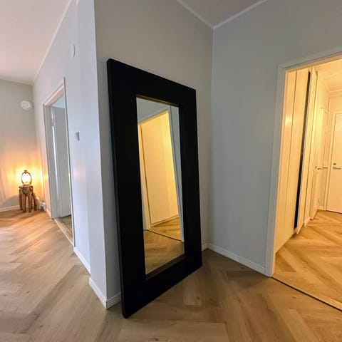 Myydään näyttävä ja tyylikäs suuri peili mustilla leveillä kehyksillä. Sopii erinomaisesti esimerkiksi makuuhuoneeseen, eteiseen tai liiketilaan.