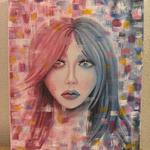Akryylimaalaus kanvaalla. Taivaan ja pilvien elementtejä, keltaisella, oranssilla, valkoisella ja sinisellä.