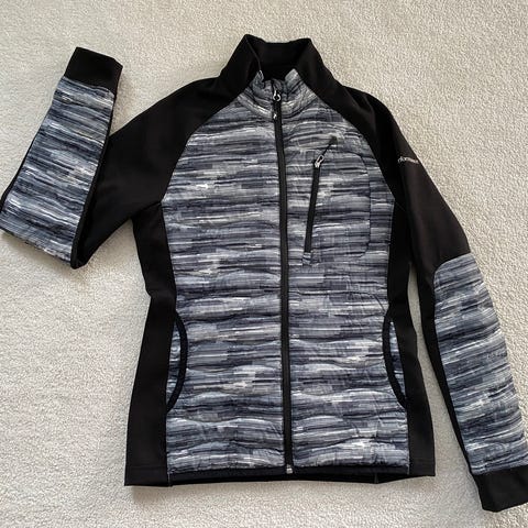Enemmän käytetty, mutta edelleen käyttökelpoinen. Vanutäyte, ei untuva. Hyvin kevyt ja notkea päällä, menee pienen tilaan. Voi käyttää pelkiltään tai kerroksena lisälämpönä kuoritakin alla. Ei tupakoitu, miedot tuoksut. Vaalean värin vuoksi minimaalisia haaleita jälkiä löytyy. Kauluksen resorin terenauhassa nukkaa, nukkakoneella lähtisi sekin. Täytetikkausten täytteet hieman kasassa, sormin käymällä läpi asettuisi kauniimmin, itseä ei häirinnyt.
