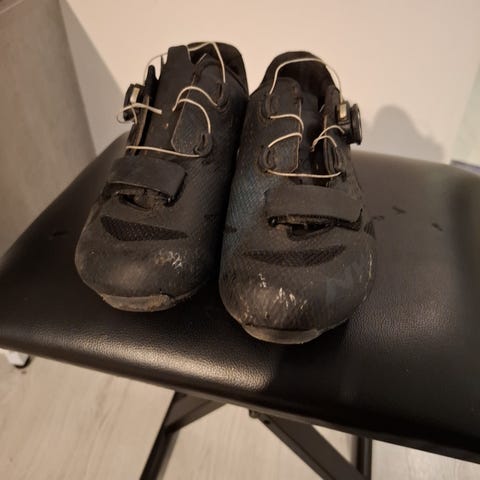 Ajettu parisenkymmentä kertaa, hieman likaa joka varmasti lähtee oikealla aineella ja vasemmassa kengässä pientä naarmua kaatumisesta, kuva kaksi.