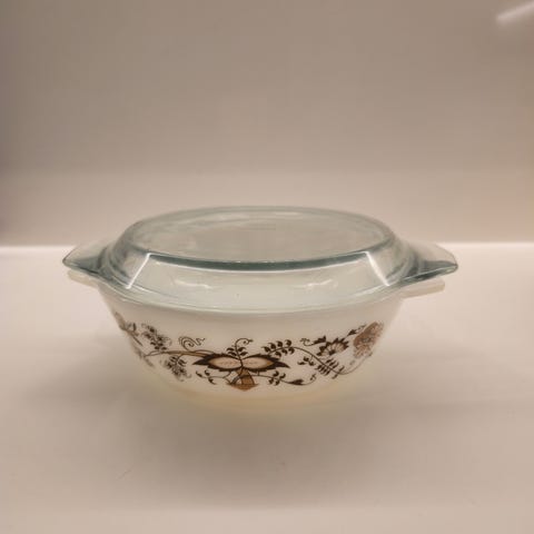 JAJ Pyrex Autumn Glory maitolasinen uunivuoka. Valmistettu 1960-1970-luvulla Englannissa. Vuoka on ehjä ja hyväkuntoinen. Valoa vasten tarkastellessa jonkin verran sisäpinnassa ja pohjassa näkyy käytönjälkeä.