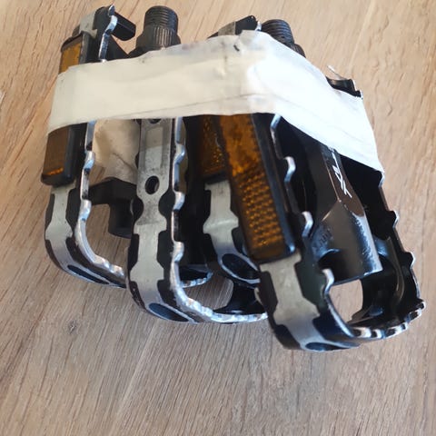 Vähän ajetut, laakerit pyörivät hyvin, mutta ruuvien kannoissa pintaruostetta kylmästä pyörävarastosta. Nykyinen malli PD-S20 maksaa näköjään Saksassa 30e. Nämä n. 10 vuotta vanhat.