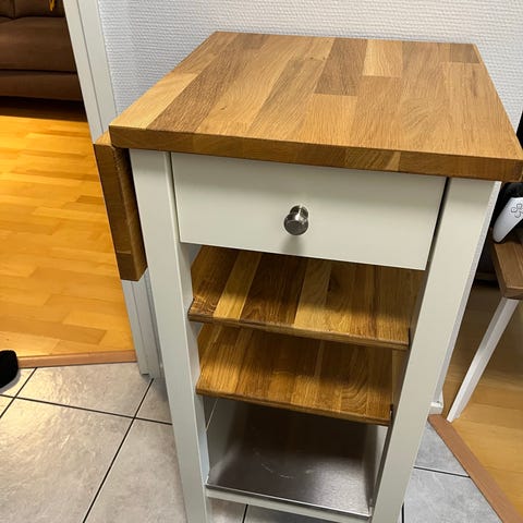 Kaunis keittiöapupöytä. Yläpinta toimii leikkuulaudan tavoin, kaappi työvälineille ja sivussa paikka veitsille. Alhaalla viiniteline. Pyörien ansiosta helppo liikutella.