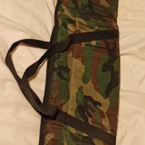 Paljon metsiä ja riistaa nähnyt tukevaa kangasta oleva asepussi 80-senttiselle aseelle. Nahkavahvikkeet. Ommel ratkennut muutaman sentin matkalta, helppo korjata (kuva 2).