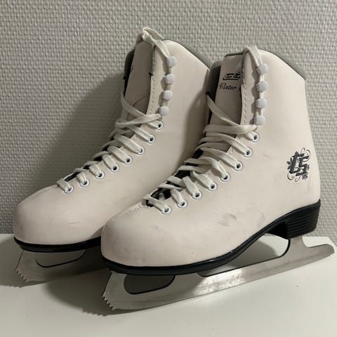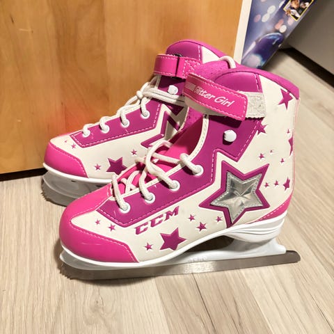 CCM lasten luistimet, koko 35. Väri vaaleanpunainen ja valkoinen, koristeltu hopeisilla tähdillä.