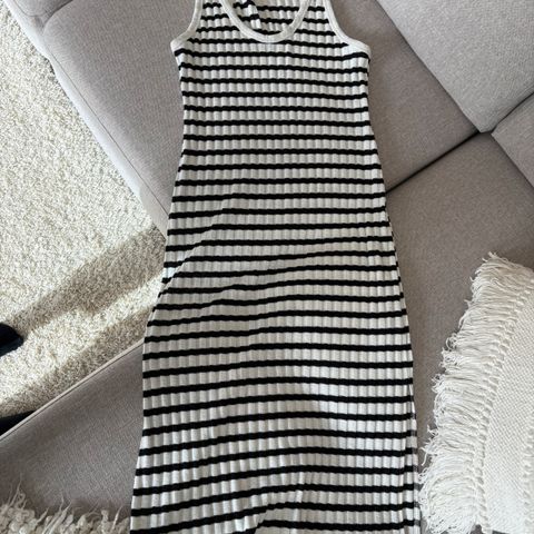 Tyylikäs pitkä neulemekko ilman hihoja. Vyötärö noin 25 cm, helma noin 33 cm, pituus 120 cm. Musta joustava ribbineulos. Istuu kauniisti ja korostaa muotoja. Sopii juhlaan tai arkeen. Joustaa, menee xs-m.