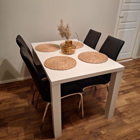 Kuvan mukainen, Jyskistä vajaat kolme vuotta sitten ostettu pöytä. Jalat saa irti, niin helpottaa kuljetusta. Maksu noudettaessa käteinen tai Mobile pay