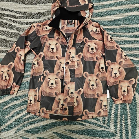 Jonathan pink and baby blue flower rain jacket long model with elastic on the back size 122. Used couple of times, washed once with unscented fabric soap. Little marks of use in the lower part inside as shown in the pictures.