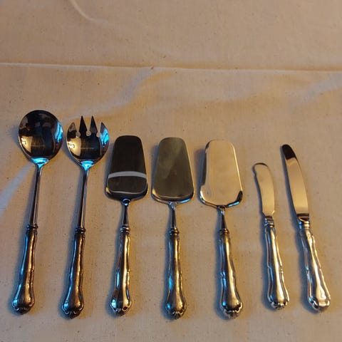 Vangat hopeiset aterimet. Kakkulapio, kaksi ruokalusikkaa ja neljä pikku lusikkaa. Hinta 10e