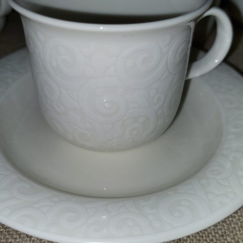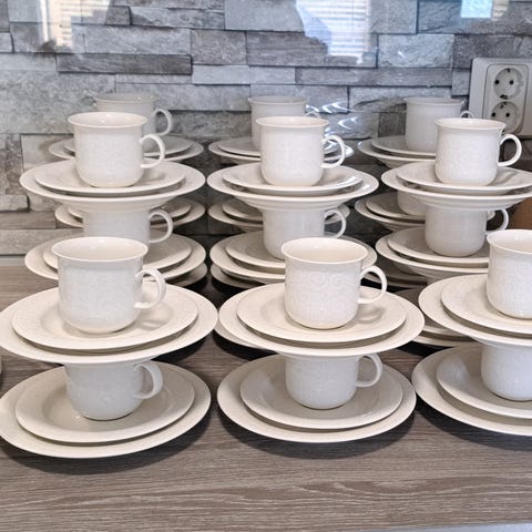 Ostan Arabian Arctica Troikka -sarjan kahvi- ja teekuppeja asetteineen. Myös muita sarjan osia voi tarjota.