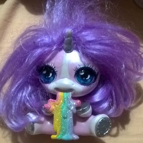 Annostelija on kauniin turkoosin värinen ja siinä on oranssihiuksinen Pebbles (Kivisten ja Sorasten tytär).