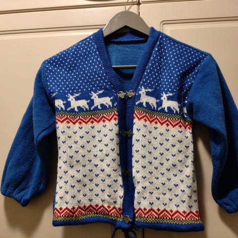 Sininen fleecetakki. Molemmilla puolilla vetoketjua, vyötärön tasolla on kiristys mahdollisuus. Tuoksuton koti.