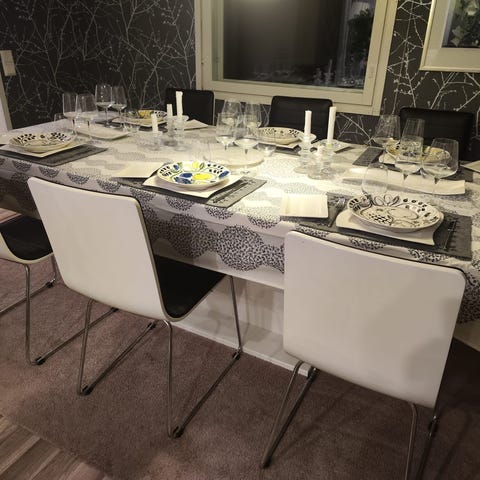 Jatkettava ruokapöytä kuudella tuolilla kaupan. Pöytä tukeva ja painava jatkettunakin. Pöydässä elon jälkiä mm. koiran hyväilemä kolmijalan tassu. Tuolit tukevat, pehmusteet vaihdon tarpeessa ( yhdessä tuolissa koiran maistelema nurkkaus ( pehmuste ).Pienellä askartelulla hyvä setti. Niin tuo pituus 138cm ja pidennettynä 185cm.