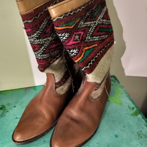 Lähinnä kotona sovitetut, liian pieniksi todetut ja sen jälkeen kaapissa ihmekasvua odottaneet erittäin hyväkuntoiset kilim-matto-nahka-bootsit. (OVH 199,95€)