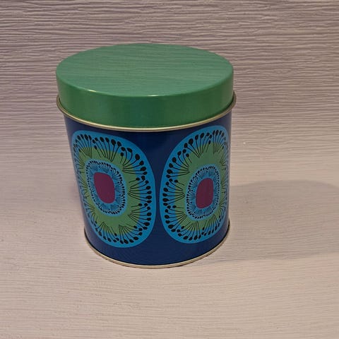 Arkikäytössä kahvipurkkina ollut peltipurkki. Ajan patinoima. Reunassa lukee: "container made in Great Britain".