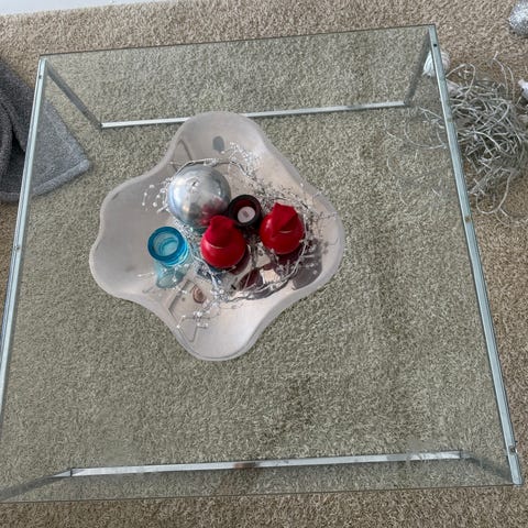 Tyylikäs lasinen sohvapöytä hyvässä kunnossa vähän on lasissa käytönjälkiä. Yläosa kirkasta lasia ja alahylly sinertävää lasia, tukevat metallijalat. Moderni ja kevyt design, sopii hyvin moneen sisustukseen.