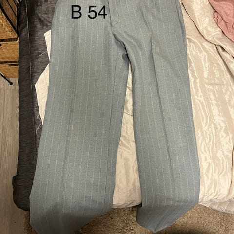 Housut: vyötärö 98cm, lahkeen ulkopituus 115cm, sisäpituus 85. Vyötäröllä levennysvaraa. Edessä laskokset, lahkeensuussa käänne (upslaaki) - väljä lahje 90-luvun tyyliin.