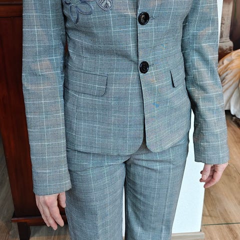 Hyväkuntoinen näyttävä liivimäinen musta yläosa-asu, kirjailtu helmin, paljetein ja lankakirjailuin. Materiaali viskoosi. Sivusaumoissa helmassa halkiot. Koko M/L