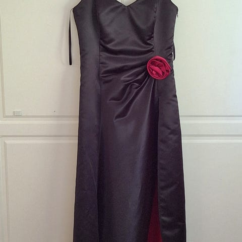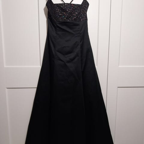Musta täyspitkä iltapuku esimerkiksi akateemiseen juhlaan. Selästä avoin. Vastaa noin kokoa 40 (olen 174 cm ja käytän kokoa 40 ja on minulle sopiva). Joustaa jonkin verran. Mekko on ollut minulla karonkassa. Ostettu juhlapukuliikkeestä, maksoi noin 200 euroa uutena. Pari kertaa käytetty.