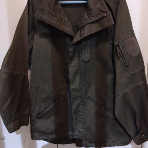 Itävallan armeijan anzug 75 takki. Koko medium-regular, eli keskimääräinen pituus ja keskimääräinen leveys. Yleiskunto on hyvä. Oikeassa povitaskussa pieni reikä (näkyy kuvassa). Kauluksen sisään piilotettavan hupun elastinen kangas on vuosien saatossa kulahtanut, mutta on silti ehjä. Takana ylhäällä selässä on pieni nirhauma (näkyy kuvassa).
