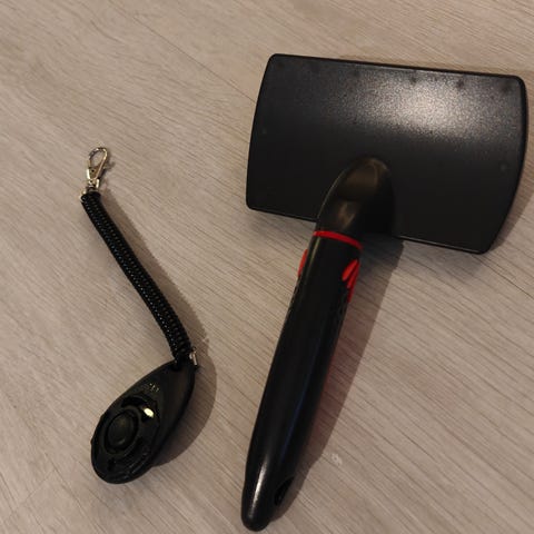 Kaappiin käyttämättä jäänyt treenilelu. Nameilla palkkaaminen toimiikin meillä paremmin. En tiedä varmuudella mitä karvaa, mutta pitkää ja karkeahkoa (epäilisin ketun tms. häntää).