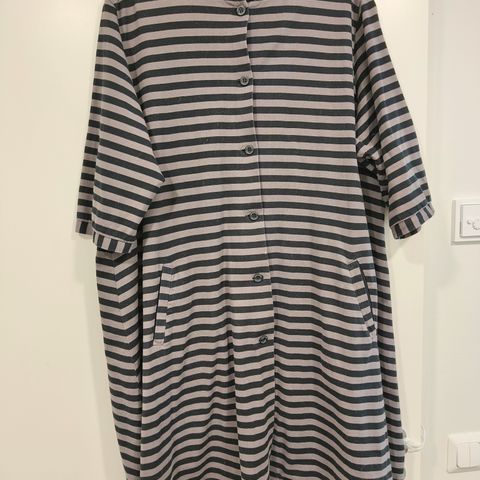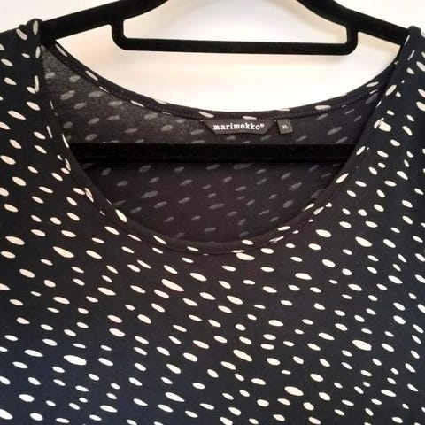 Musta tunika valkoisilla pilkuilla. Nimi: musta kottarainen, merkki: Marimekko. Koko: XL. Joustavaa kangasta. Kai-kai: 53 cm. Pituus: 78 cm. Leveys: n. 91 cm helmasta.