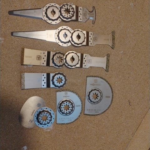Fein Starlock monitoimityökalun teräsarja sisältää erilaisia teriä eri käyttötarkoituksiin. Sarjassa on tehokas metalliterä, kaavinterä, hiomaterä,lasikuituterä, saumaterä, puunleikkuuterä.. Terät on suunniteltu sopimaan Starlock-kiinnitysjärjestelmään ja ne soveltuvat monipuoliseen materiaalien käsittelyyn, kuten metallin, puun ja muiden materiaalien leikkaamiseen ja hiontaan. Yhtä terää vähän käytetty/testattu. Alkuperäisiä fein teriä, jäänyt itselle tarpeettomaksi. Sieltä kun googlelinssillä katsoo, näet paljonko maksaa.