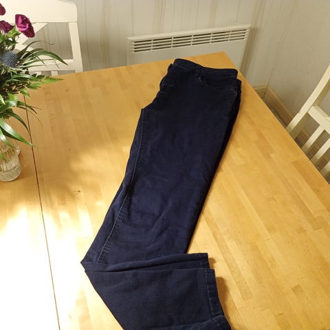 Myydään tummansiniset siistit housut, malliltaan kuin farkut, mutta pehmeää kangasta. Siisti käytetty kunto.