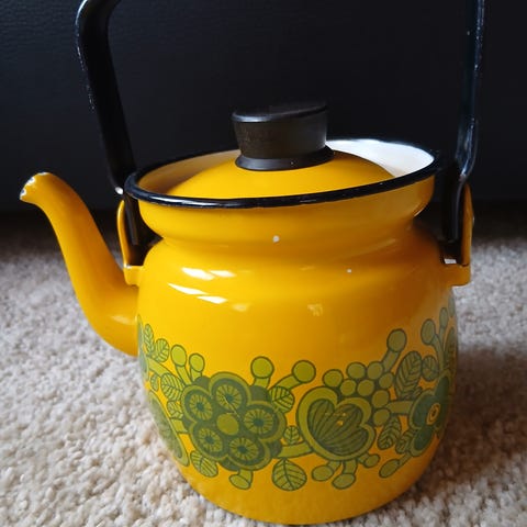 Finel emalikahvipannu. Ehjä sisusta ja ulkokuori,kannen sisäpuolella pieni maalivirhe. Nouto/postitus.